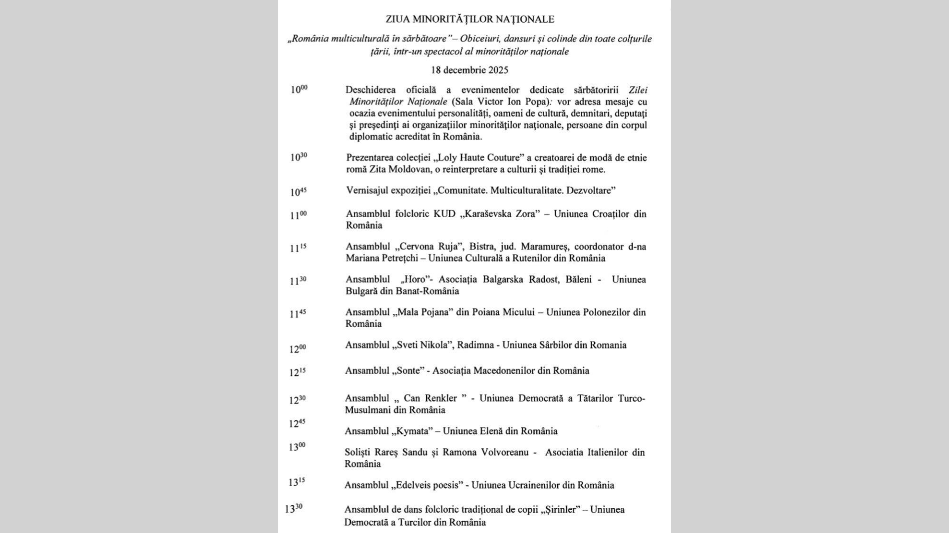 Programul va începe la ora 10:00 și va include deschiderea oficială a evenimentelor dedicate Zilei Minorităților Naționale, în Sala „Victor Ion Popa”. Cu acest prilej, vor adresa mesaje personalități publice, oameni de cultură, demnitari, deputați și președinți ai organizațiilor minorităților naționale, precum și membri ai corpului diplomatic acreditat în România.